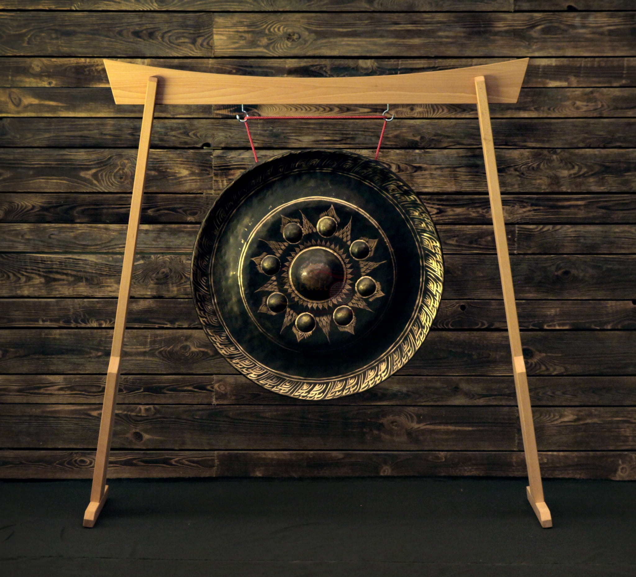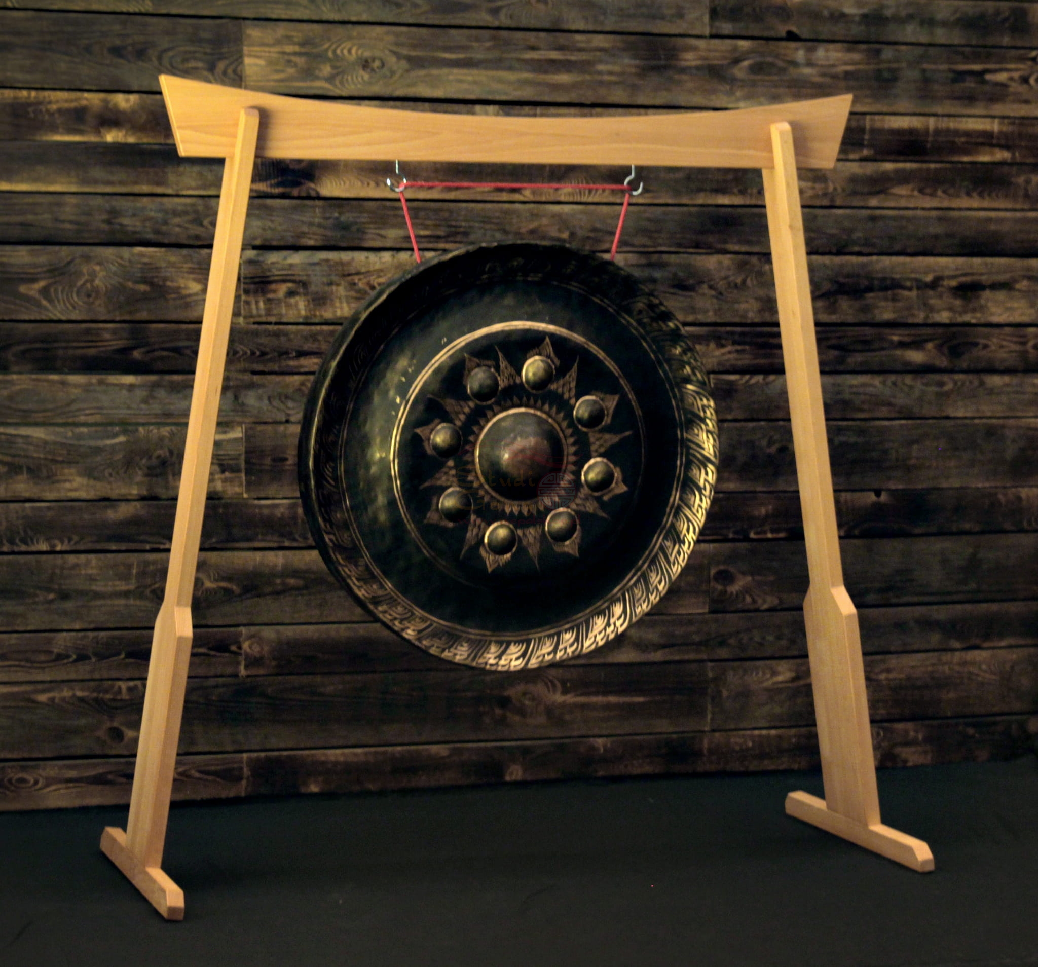 Drewniany stojak na gong o maksymalnej średnicy 100 cm wykonany w całości z drewna bukowego. Drewno jest zaimpregnowane olejem wzmacniającym właściwości mechaniczne, odporność na wilgoć oraz zabrudzenie.