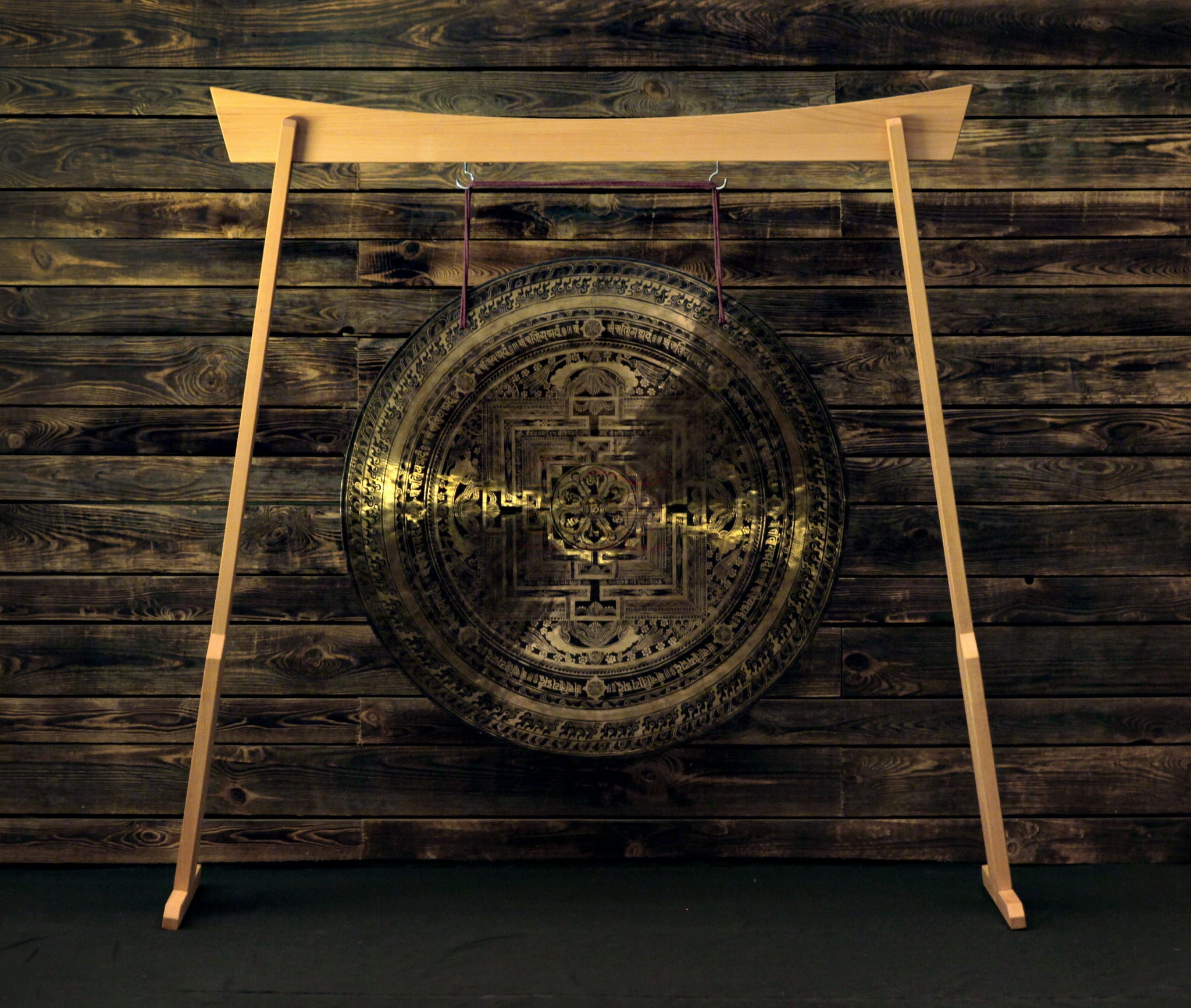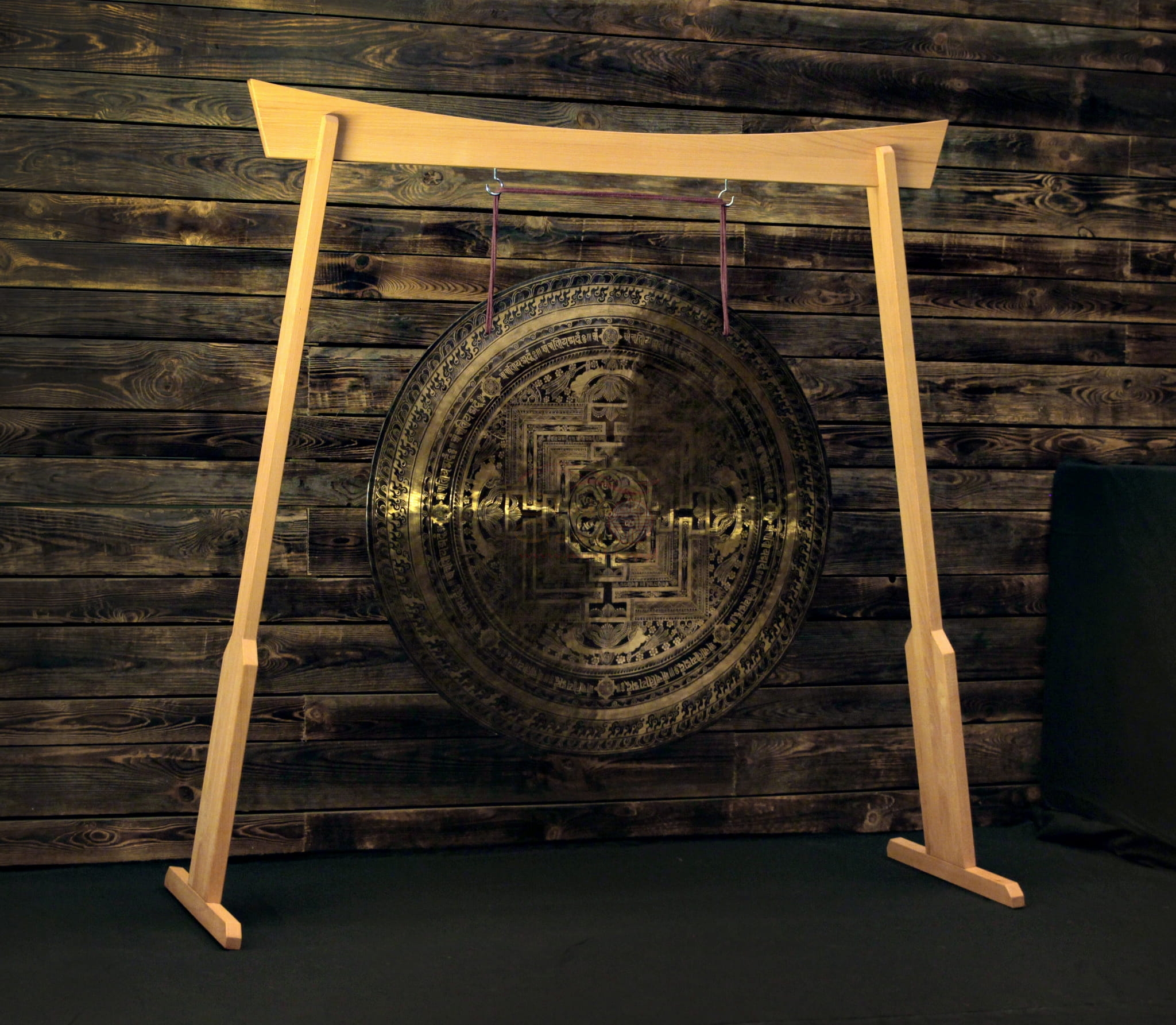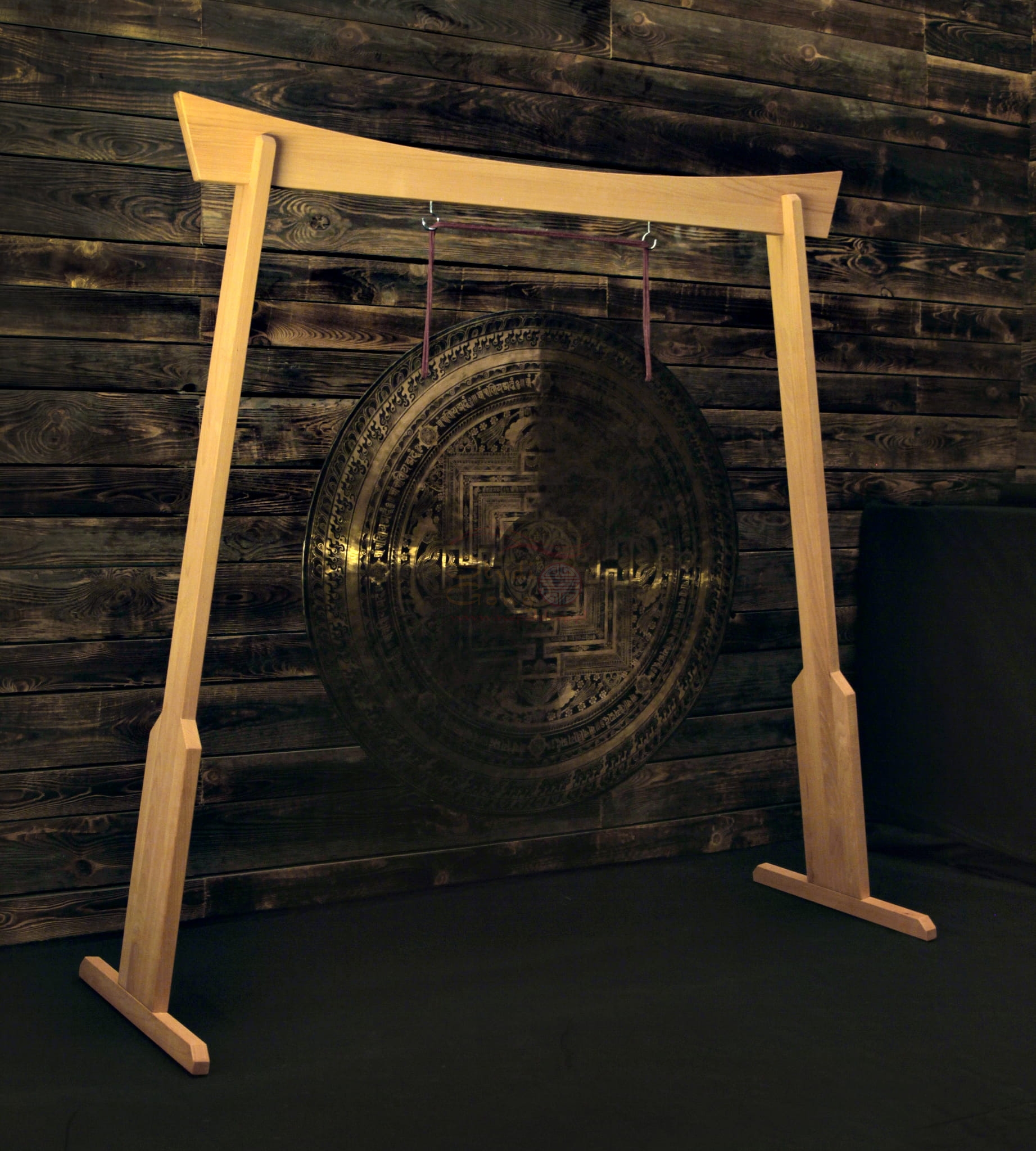 Drewniany stojak na gong o maksymalnej średnicy 120 cm wykonany w całości z drewna bukowego. Drewno jest zaimpregnowane olejem wzmacniającym właściwości mechaniczne, odporność na wilgoć oraz zabrudzenie.