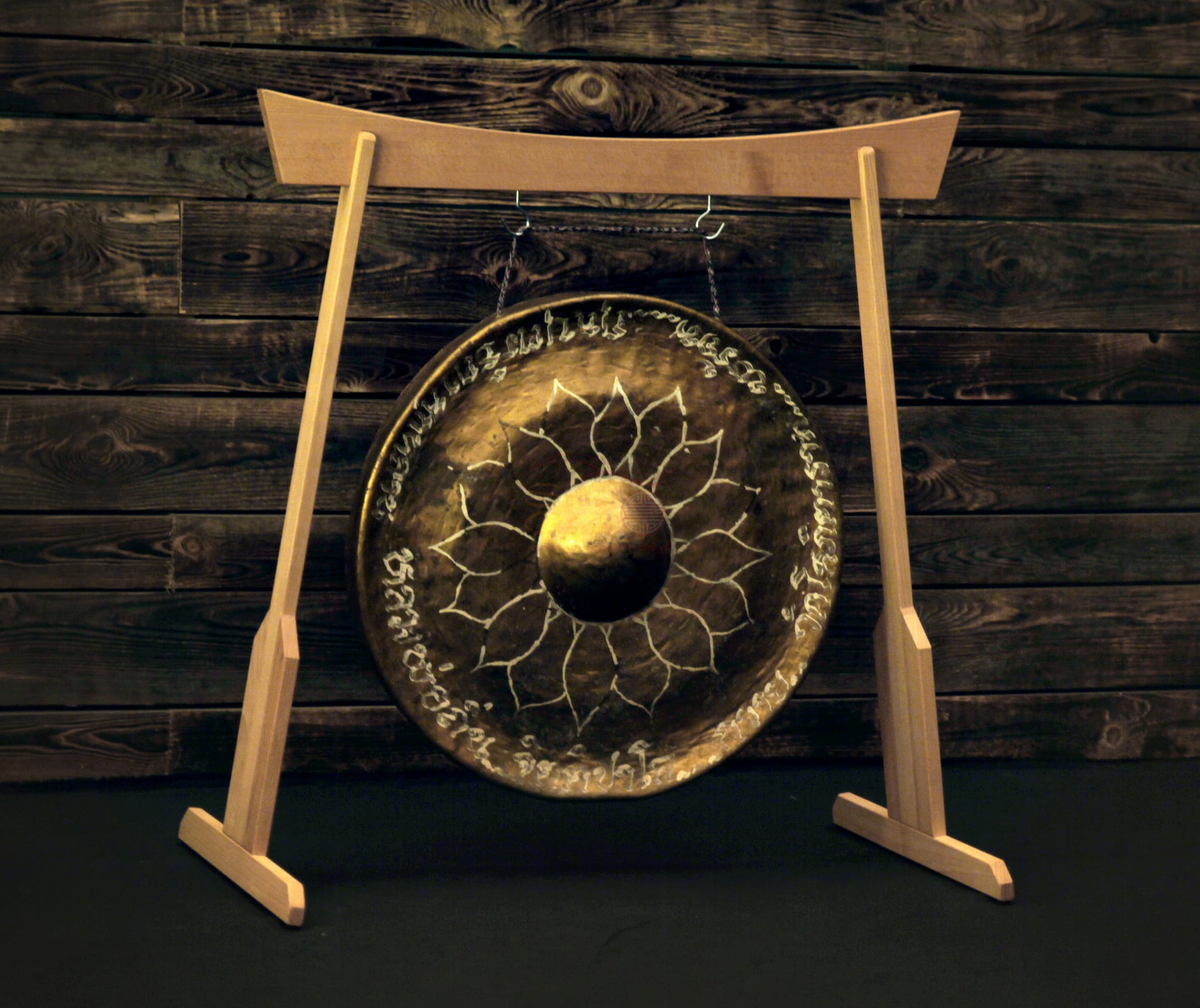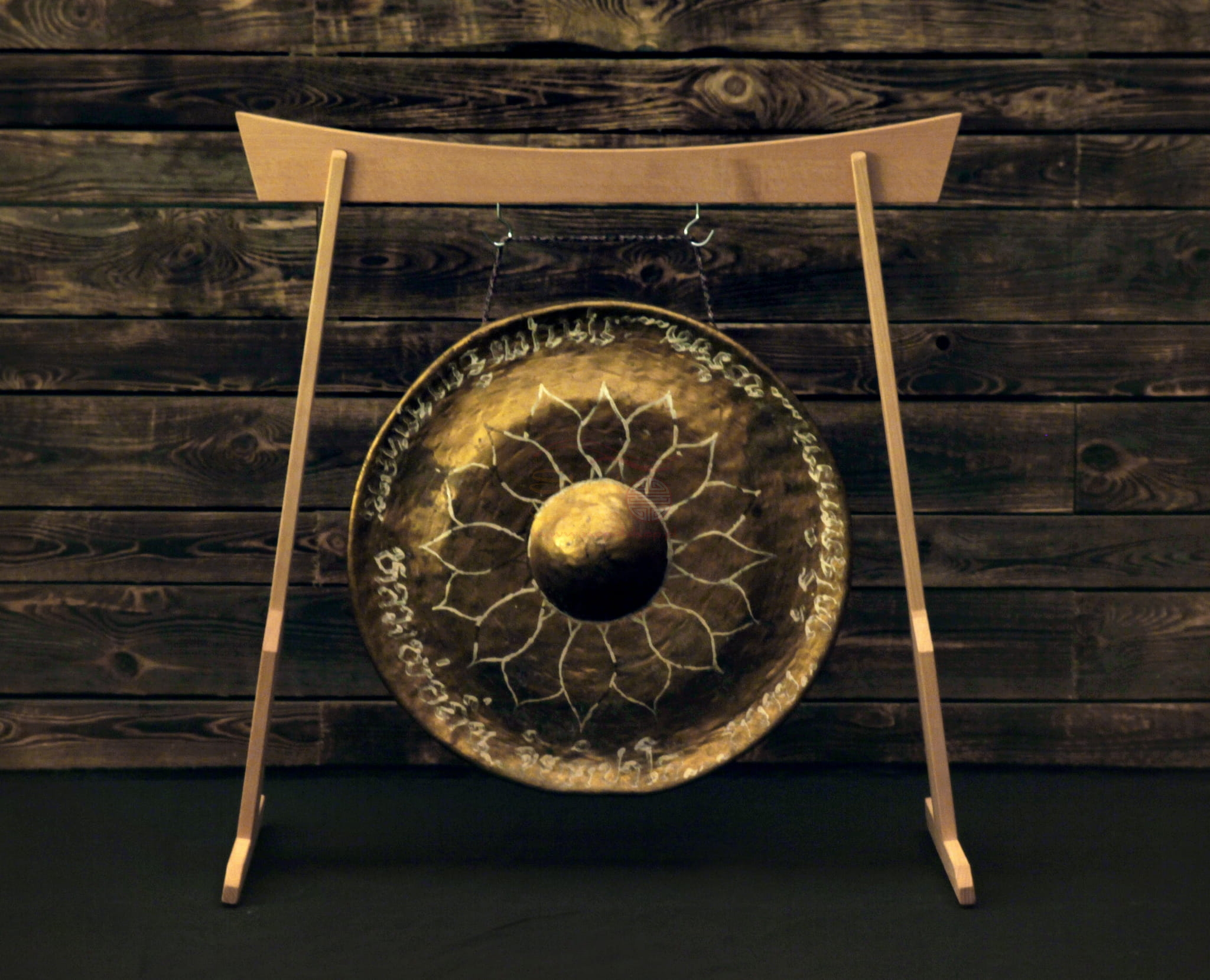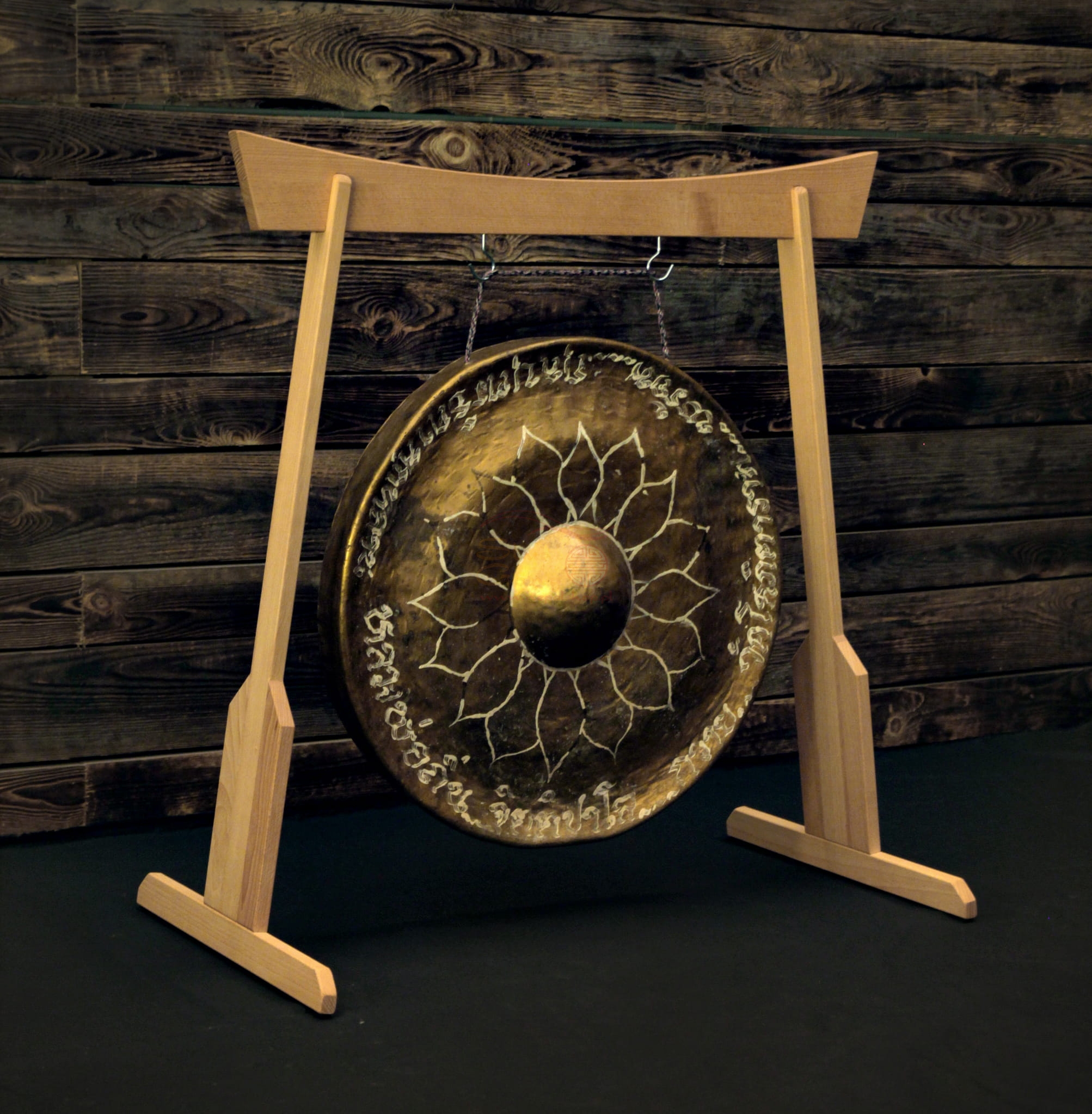 Drewniany stojak na gong o maksymalnej średnicy 60 cm wykonany w całości z drewna bukowego. Drewno jest zaimpregnowane olejem wzmacniającym właściwości mechaniczne, odporność na wilgoć oraz zabrudzenie.