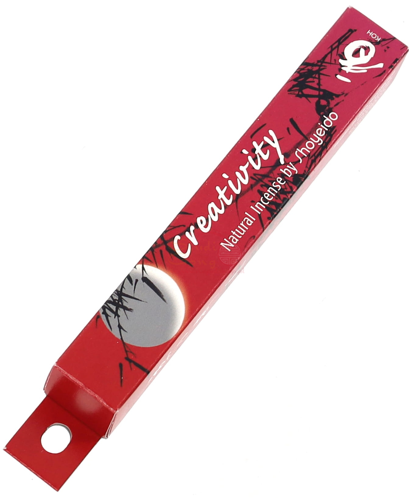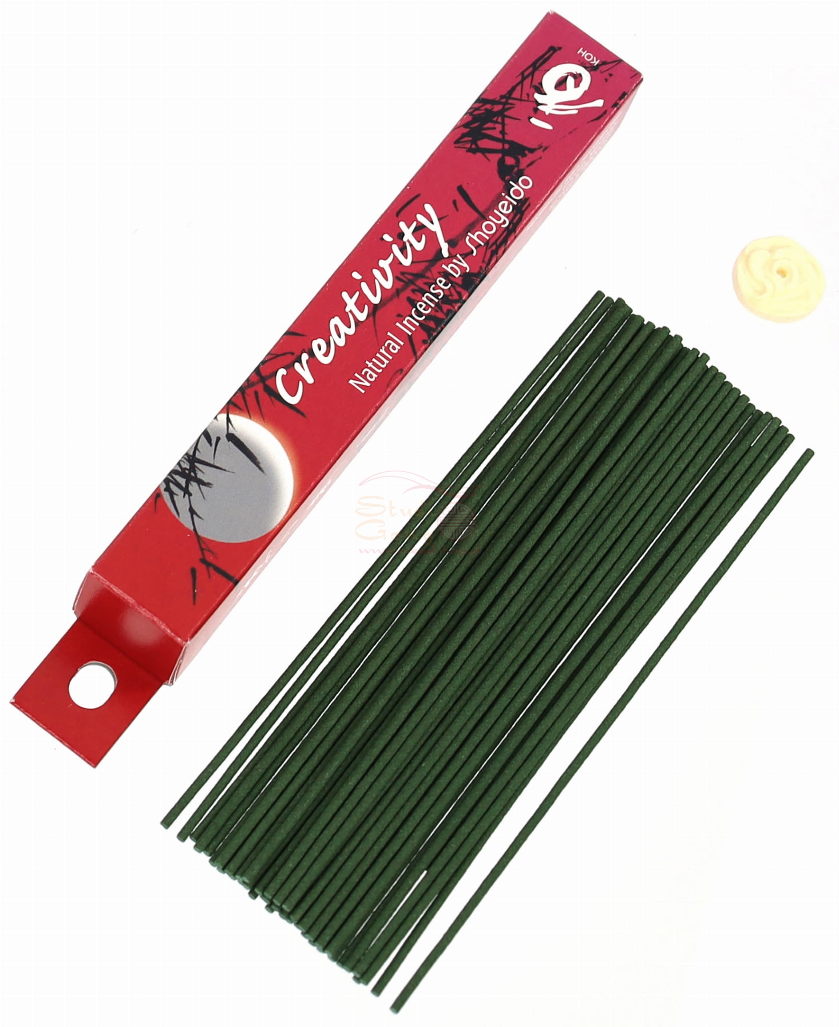 Kartonowe pudełko zawiera kadzidła oraz biodegradowalną podstawkę pod kadzidło.